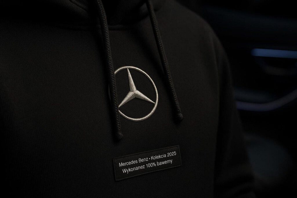 Materiał wpływa na wygodę i trwałość. Mercedes-Benz często sięga po miękką bawełnę ring-spun oraz tkaniny techniczne, które chronią przed deszczem i wiatrem, a jednocześnie „oddychają”. W bluzach sportowych spotkasz DRYCELL, który odprowadza wilgoć.